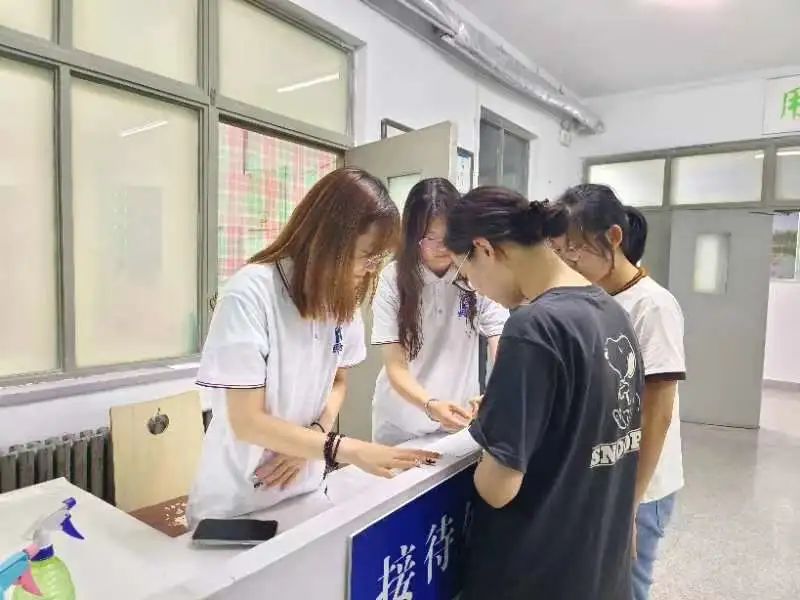 在新生宿舍楼内,活力满满的助理班主任们用自己的热情和笑脸迎接着每一位新生,帮助他们办理入住登记、发放宿舍钥匙,带领他们入住宿舍、搬运行李。