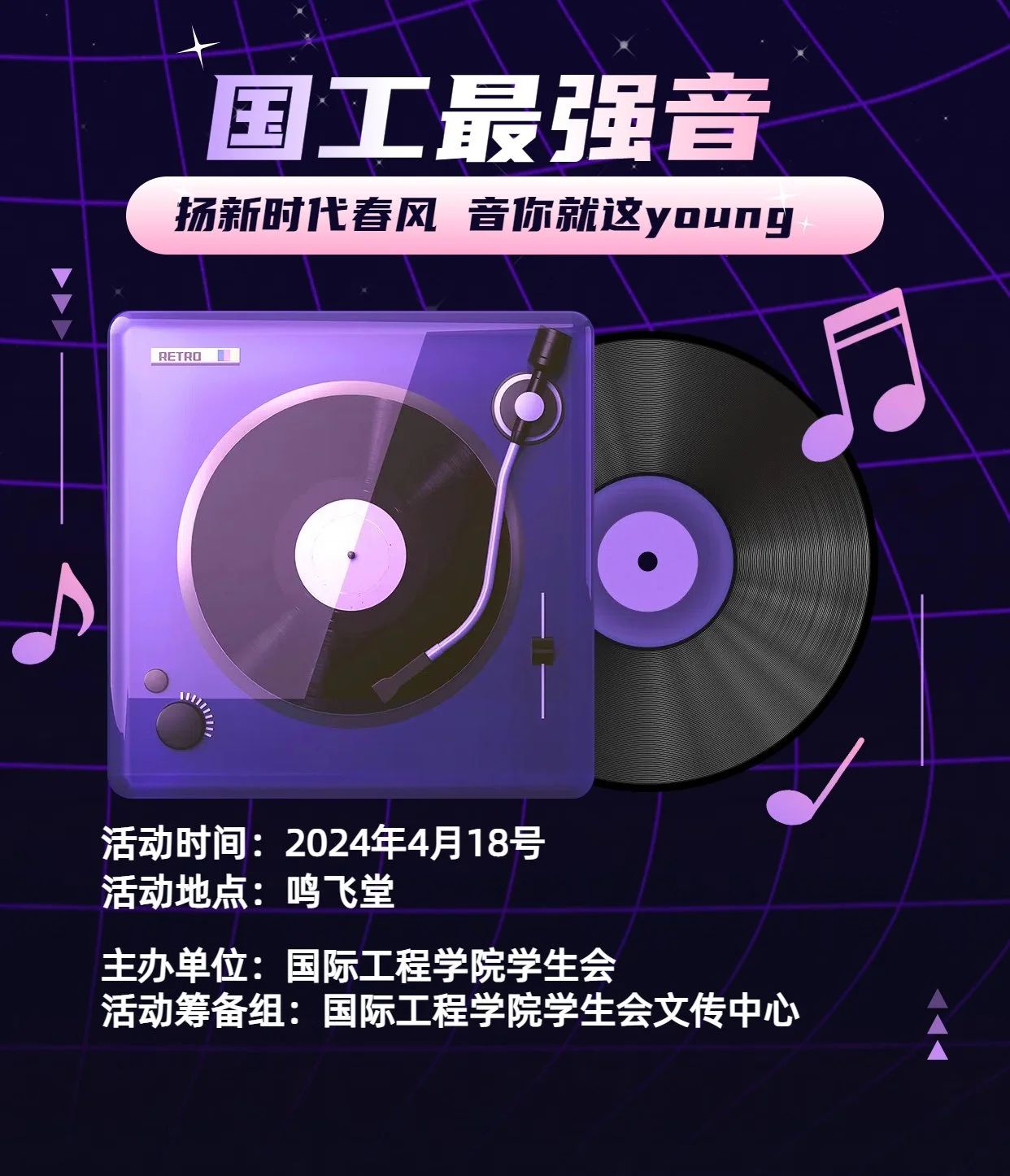 为了丰富同学们的课余生活,让同学能够充分、健康的利用课余时间,同时给同学展示自我的舞台,公司特此开展本届歌唱大赛。当歌声与青春碰撞,激情被点燃,梦想被照亮。希望同学们在歌唱中点燃青春之光,同时能够更好的融入到有趣课余生活中来,更好的丰富国工校园文化生活。