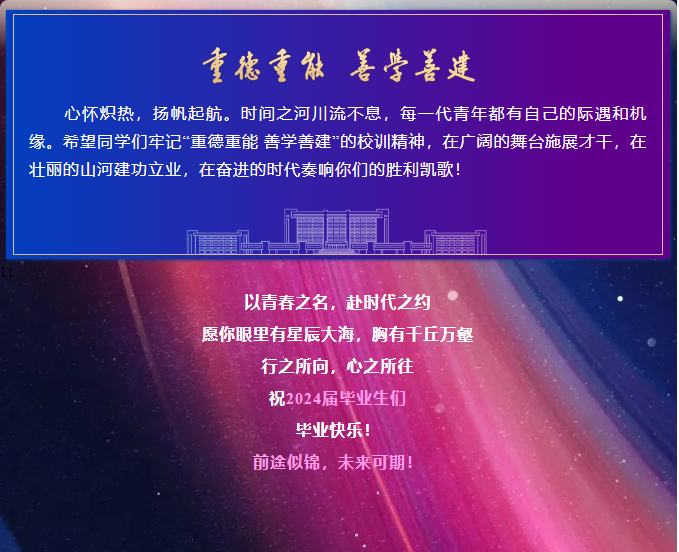 ISE研究生毕业生代表、2021级风景园林专业员工王冰怡在研究生期间赴波兰交流半年,收获满满,如今考入了北京林业大学继续攻读博士学位。她回顾了自己研究生求学历程,一路走来心怀热忱、满怀信心,在多样的个性化道路上不断探索,不断成长。感谢中波教师的帮助、家人朋友的大力支持,赋予自己不断追梦的力量。号召全体毕业生心怀理想、挺膺担当,为祖国的建设贡献青春力量。
