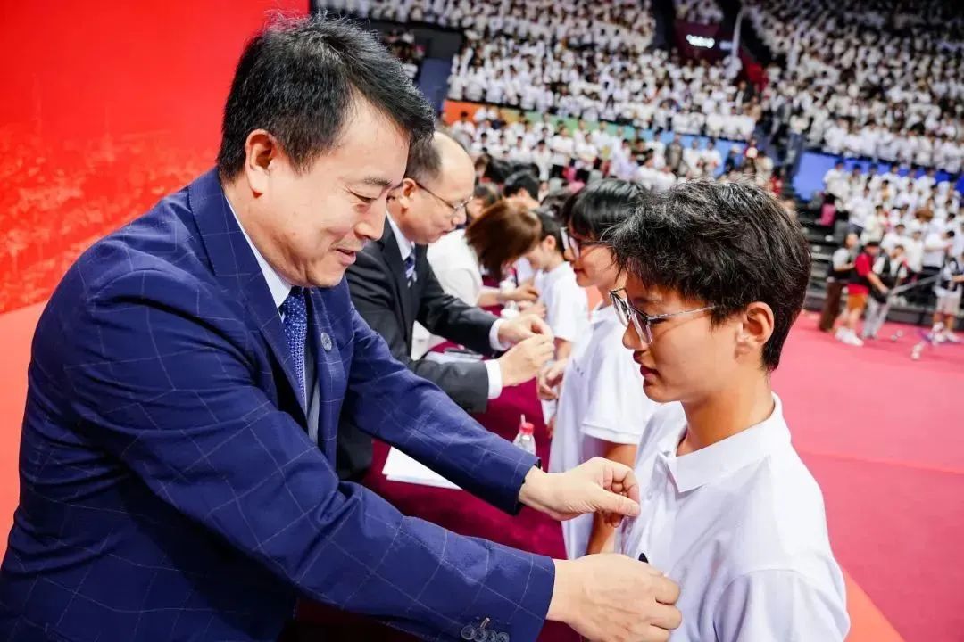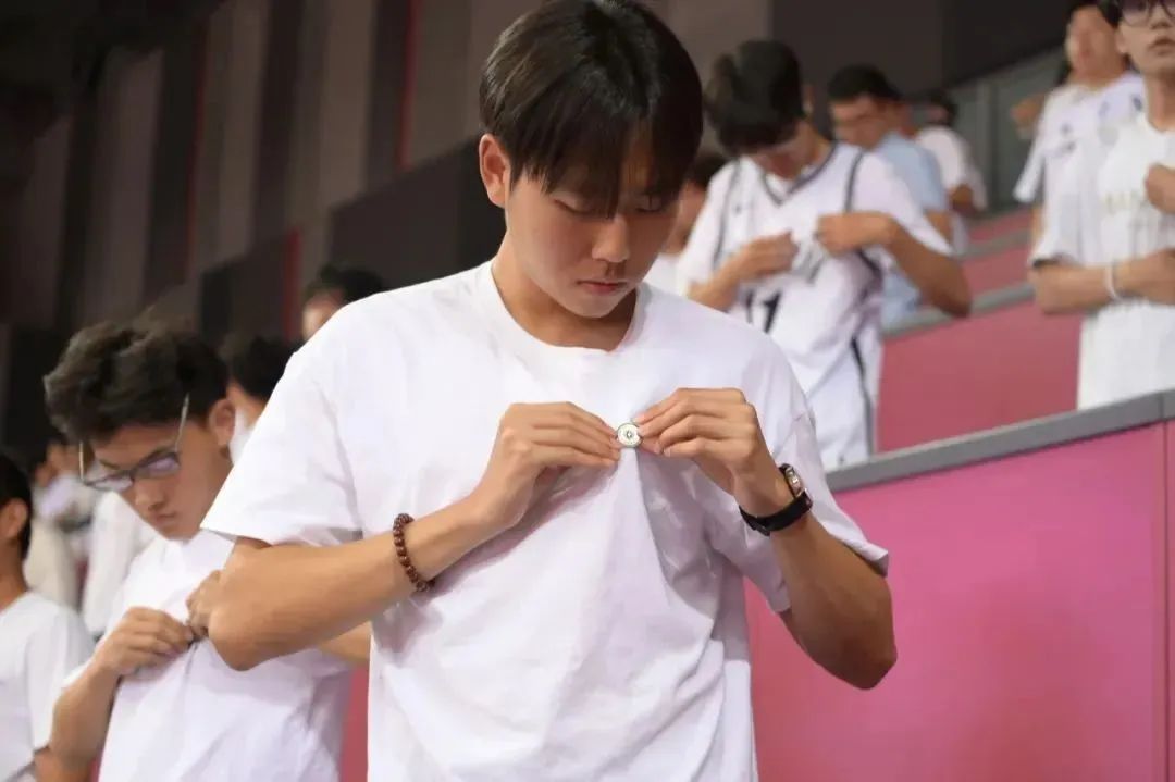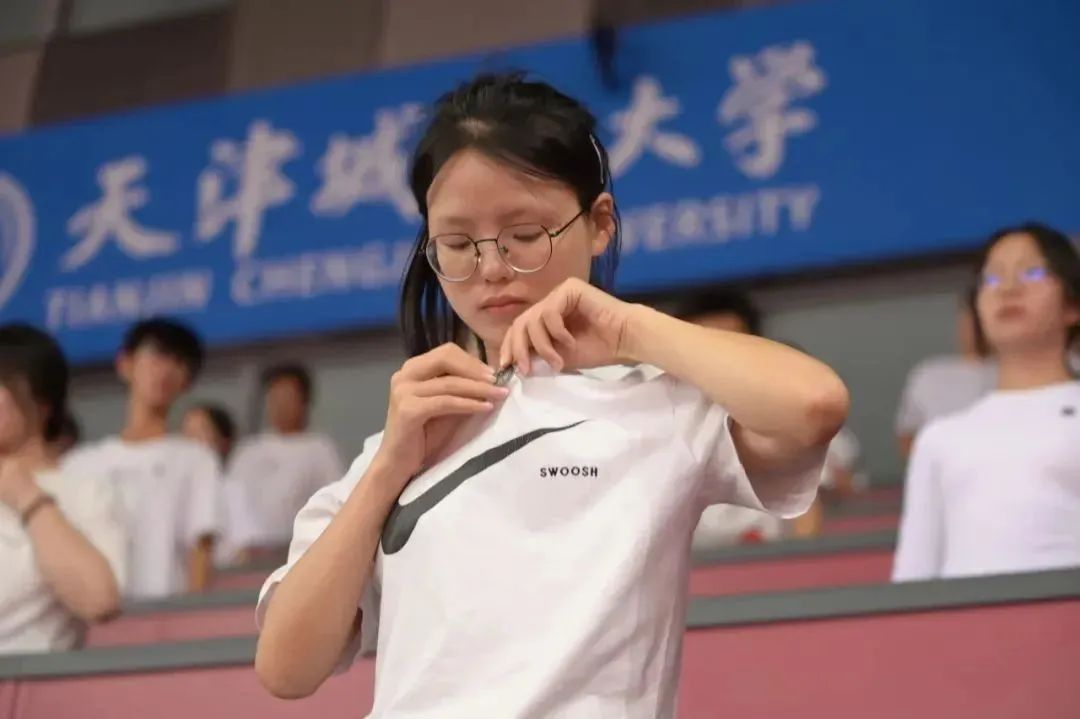 今年开学典礼特别设计了佩戴校徽环节,主席台上领导为新生代表佩戴校徽,全体2024级新生同步将校徽戴在胸前,胸前的校徽熠熠闪光,此刻大家正式成为光荣的“天城大”人,承担起爱校荣校、传承弘扬天城大精神的责任和使命。