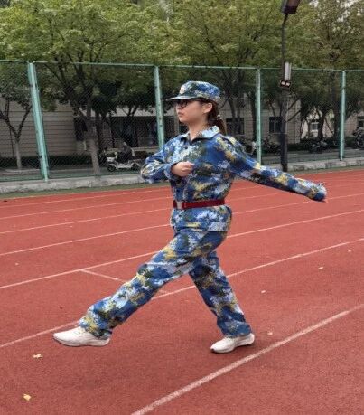 跑道上,陈馨懿专注打磨正步动作:手臂摆动的幅度、腿部抬落的高度,每一处细节都透着对 “标准” 的执着。她眉峰凝劲,眸光如炬踏正途,棱角分明的脸庞上盛满炽热的星光,将信念刻进每一次摆臂踢腿中。反复练习中,“刻苦” 是她最鲜明的标签,汗水滴落的轨迹,成了军训场最美的线条,也让她成为队列里公认的 “动作标杆”。