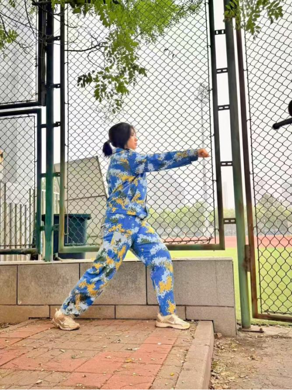 风景园林合1班的危倪嘉,将 “纪律” 二字刻进日常训练的每一秒。从清晨集合时的准时到位,到训练中对动作标准的严格恪守,她从未有过丝毫松懈。烈日当空时,她攥紧的拳头里藏着不松懈的意志;暮色降临后,她专注的目光仍追随着教官的示范动作。
