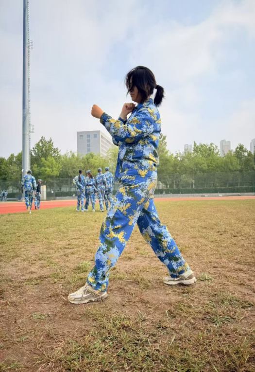 她从不因疲惫降低对自己的要求,迷彩服上的汗渍是他自律的勋章。当班级需要调整队列间距时,她总能第一时间找准位置,成为队伍里的 “定位仪”,用日复一日地守序,为集体荣光筑牢根基。