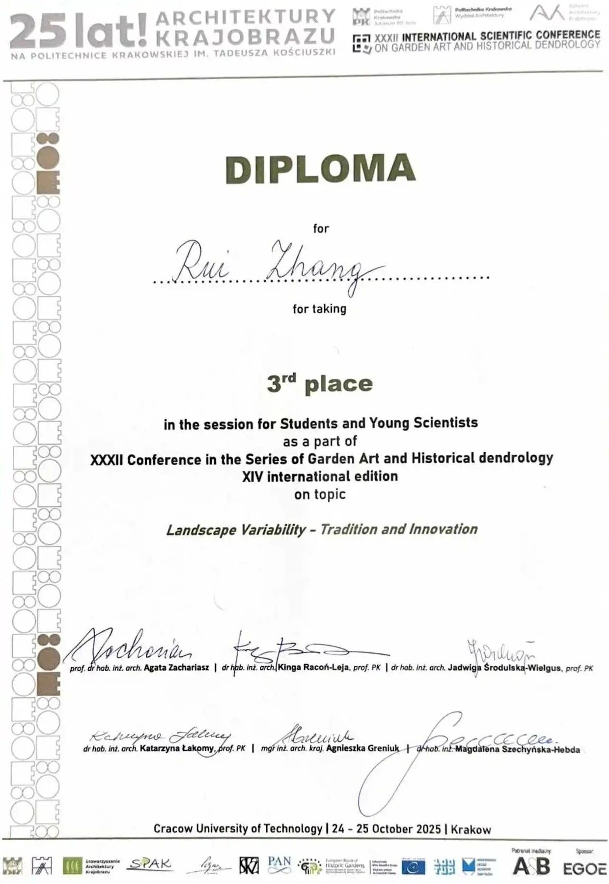 尤其值得骄傲的是,该奖项的前两名获得者均为博士研究生。张锐同学作为硕士研究生取得这一成绩,实属难能可贵。奖项由克拉科夫工业大学风景园林系主任Agata Zachariasz教授领衔的多位资深教授评审团共同评定并颁发,这份沉甸甸的荣誉充分彰显了bevictor伟德硕士公司产品的卓越质量与国际化学术水平。