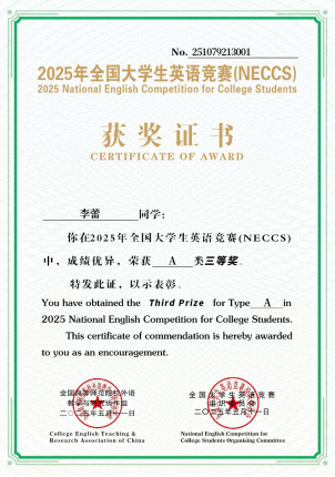 在学术科研上,始终保持严谨务实的治学态度,课堂专注互动、课后查漏补缺,专业成绩名列前茅。发表学术期刊,积极参与专业竞赛并获国家级、省级奖项,以赛促学提升专业能力,注重个人技能提升,通过老员工英语六级、全国计算机等级考试二级,在雅思考试中取得6分成绩。