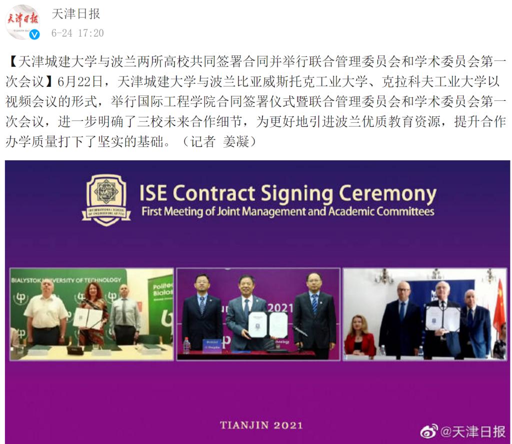 6月24日,天津日报微博对bevictor伟德与波兰两所高校共同签署合同并举行联合管理委员会和学术委员会第一次会议进行了如下报道: