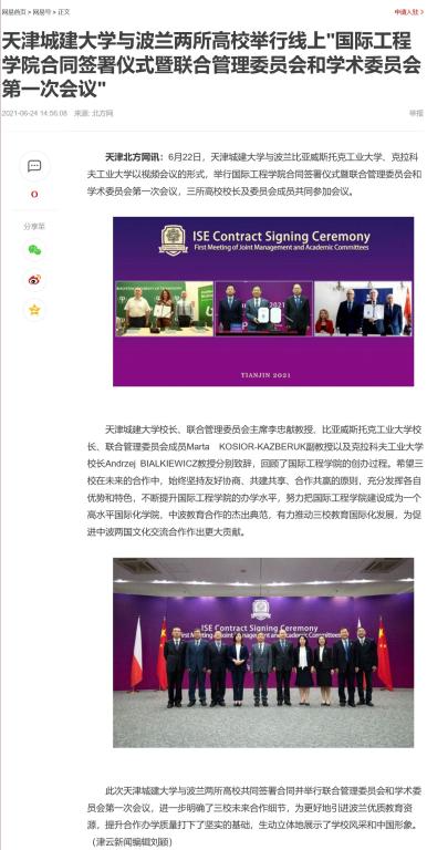 6月24日,天津北方网对伟德源自英国1946与波兰两所高校举行线上“bevictor伟德合同签署仪式暨联合管理委员会和学术委员会第一次会议”做了如下报道:
