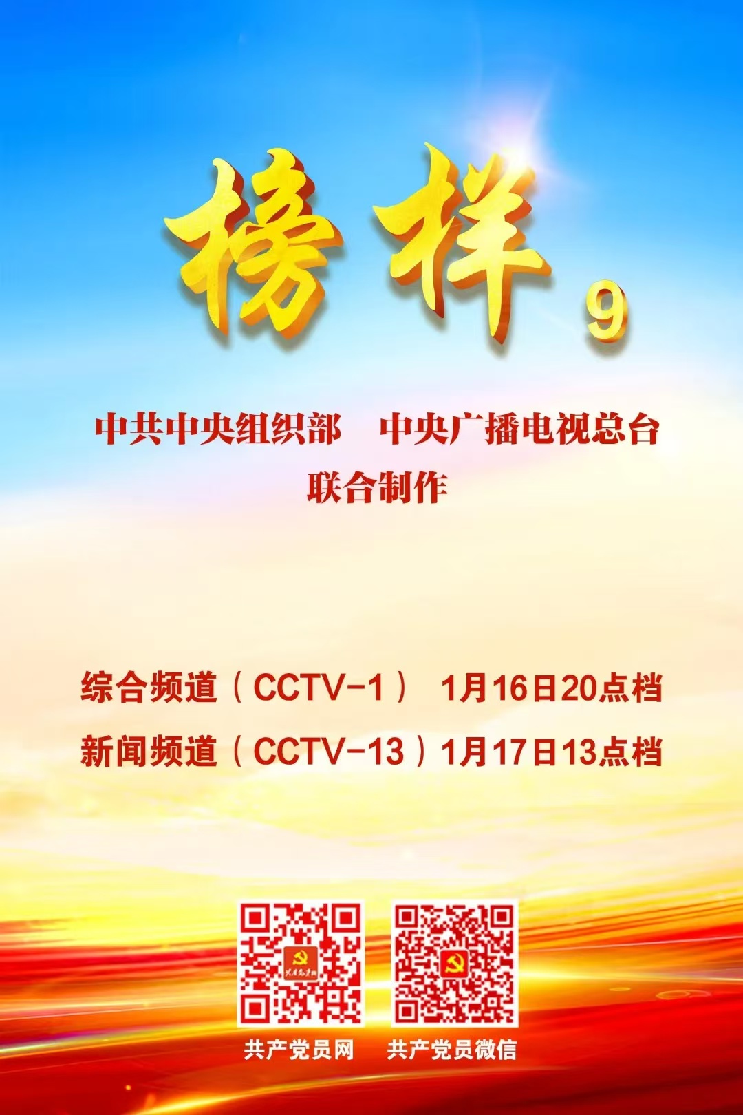 该节目将于2025年1月16日在中央电视台综合频道(CCTV-1)晚间8点档首播,1月17日13点档在中央电视台新闻频道(CCTV-13)重播,在共产党员网(www.12371.cn)、共产党员微信、全国党员干部现代远程教育专用频道集中展播。共产党员网首页提供节目下载。请学习收看。