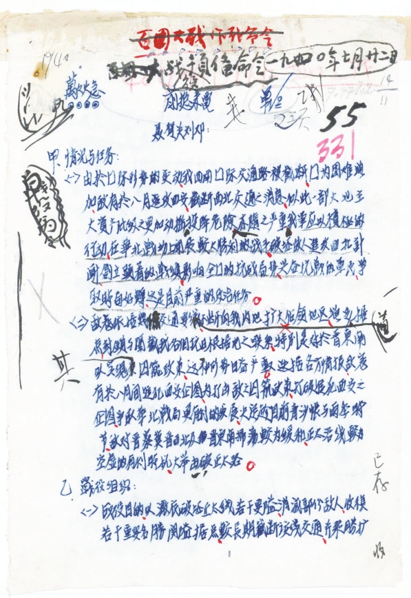 1940年8月8日,《朱德、彭德怀、左权关于破击正太路的战役部署》(中央档案馆 藏)