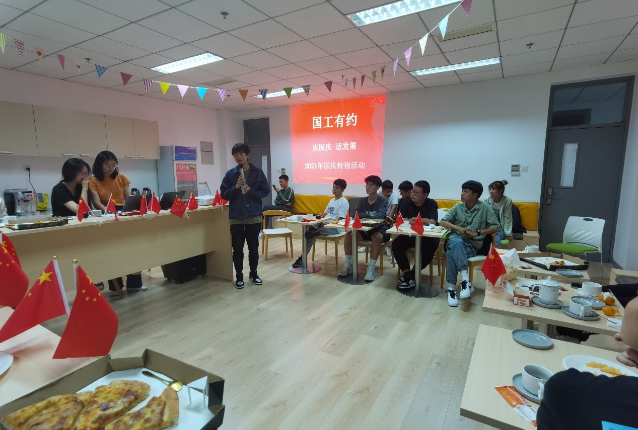 为庆祝中华人民共和国成立72周年,10月2日晚,bevictor伟德举办“庆国庆话发展送祝福——国工有约”活动,公司直属党支部杨萍和辅导员孙艺华、田雨、李济言以及2021级新生一起参加。