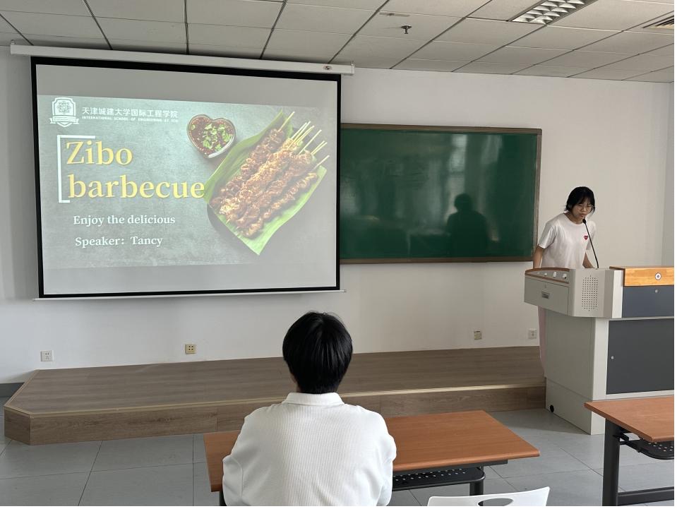 首先,刘晓琳同学以淄博烧烤为例,为大家分析总结了汉译英翻译技巧,并介绍了饮食文化相关的专有词汇,让同学们更好地应对翻译题型。